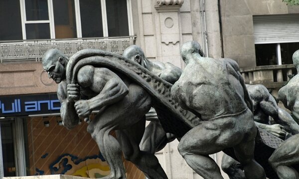 After looking at the city of Vigo from the top of the hill , we came back down . . . It is probably unclear from the photo, but walking up and down the city was exhausting . . . Pictured below was a monument on one of the streets. Whether dedicated to fishermen or bargemen... |