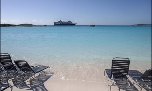 Pink flamingos meet vacationers in the port.